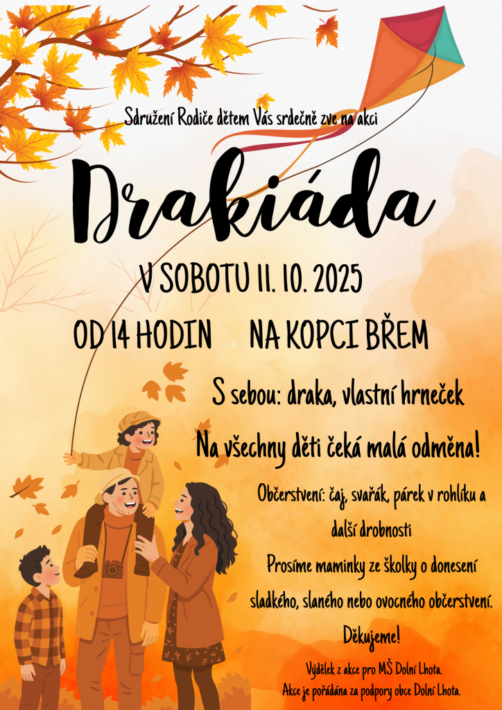 Sdružení Rodiče dětem Vás srdečně zve na Drakiádu, která se koná v sobotu 11. října 2025 od 14 hodin na kopci Břem.