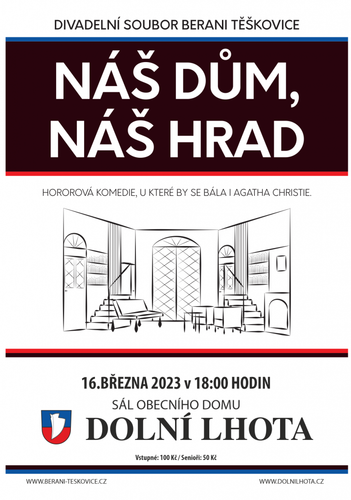 Ochotnické divadlo s názvem Berani z Těškovic si pro Vás připravilo hru s názvem "Náš dům, náš hrad". Divadlo v Těškovicích má hluboké kořeny, tradici ochotnického divadla udržují a rozvíjí od roku 1897. V roce 2022 oslavili 125 let. Více informací najdete na webu souboru: www.berani-teskovice.cz
