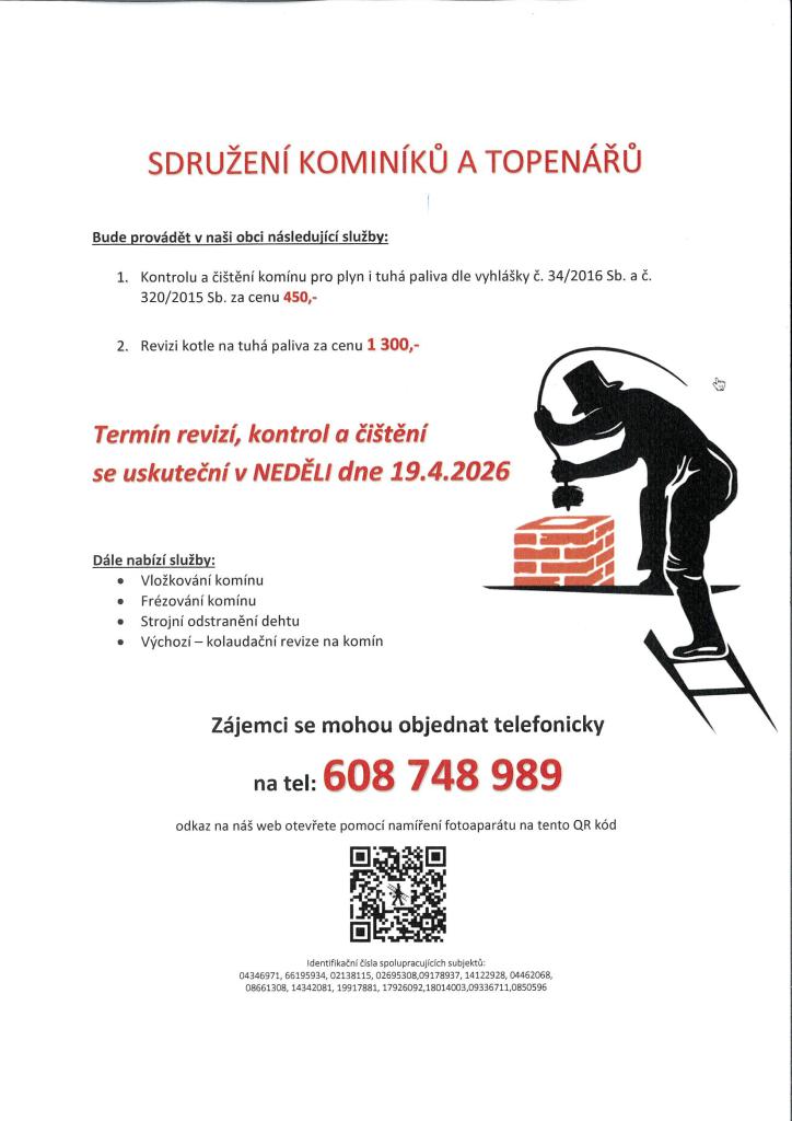 V naší obci se dne 19. dubna 2026 uskuteční kontroly a čištění komínů pro plyn i tuhá paliva. Služby zahrnují také revizi kotlů a další odborné úkony jako vložkování a frézování komínů.